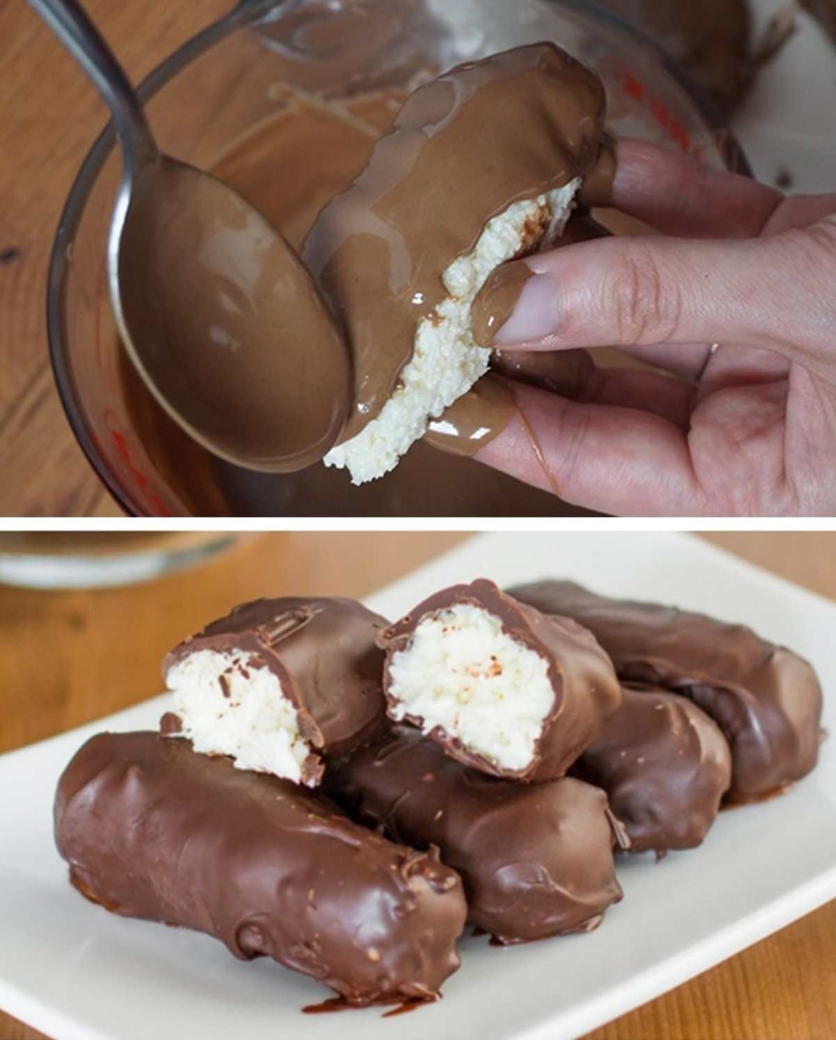 Nel frattempo, sciogliete il cioccolato al latte e mettetelo in una ciotola. Non deve essere caldo, ma leggermente più freddo. L’ultimo passaggio è ricoprire le barrette di cocco con il cioccolato.