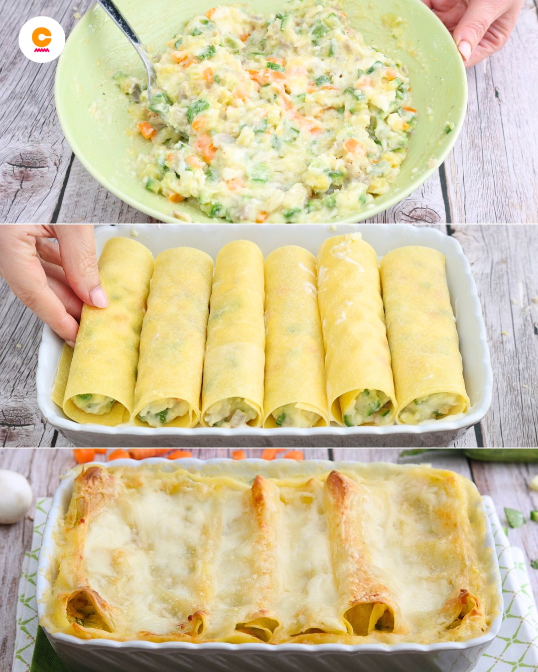 I cannelloni con verdure è un primo ricco e gustoso a base di pasta fresca all’uovo farcita con carote, zucchine, funghi, parmigiano e stracchino, poi arrotolata, disposta in una pirofila e ricoperta di besciamella: il risultato è una pietanza gratinata in superficie, morbida e cremosa al morso.
