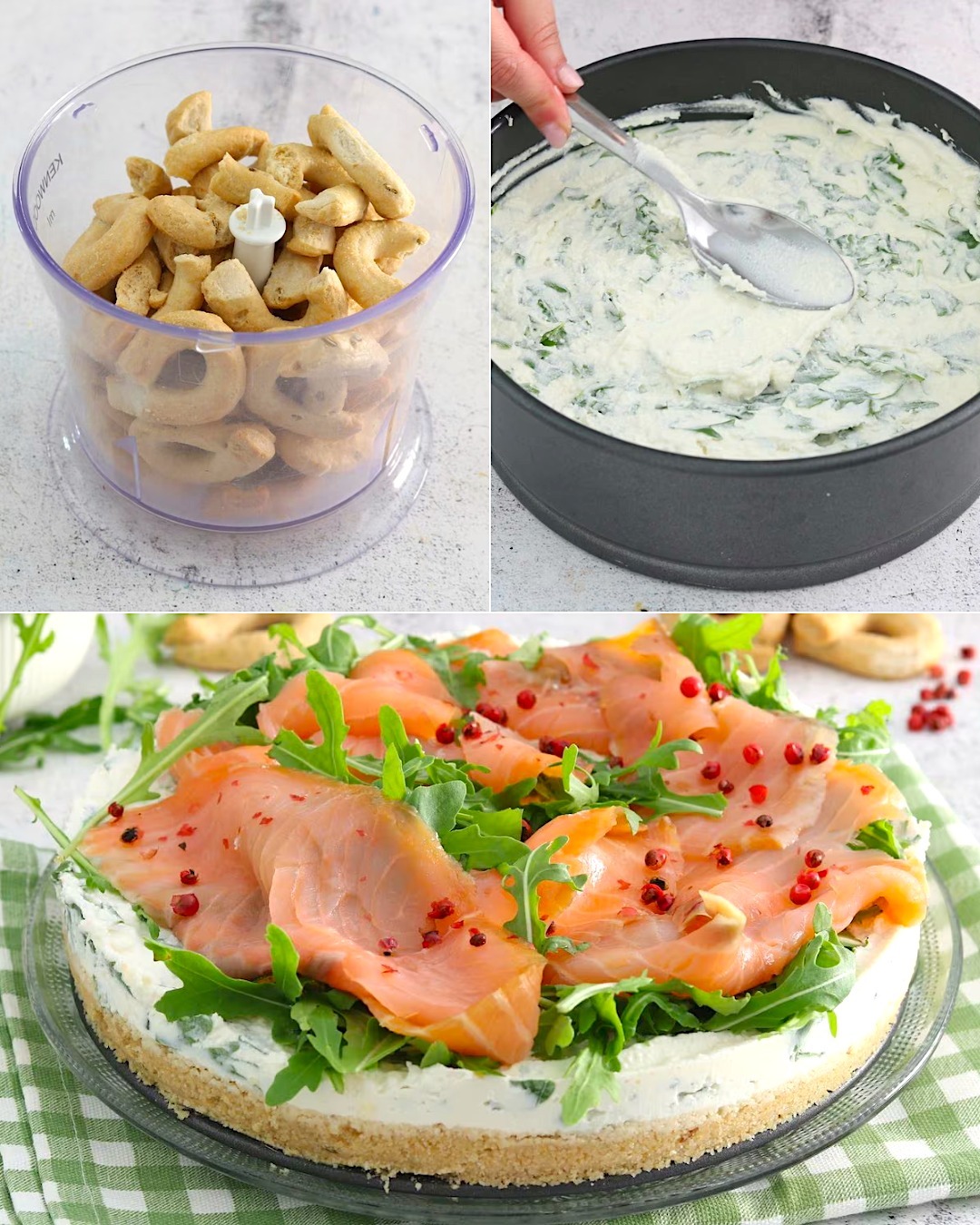 La cheesecake al salmone è una torta salata fresca e leggera, perfetta per l’estate, poiché non richiede cottura in forno, ma solo un riposo in frigo. Si compone di una base croccante di taralli e burro fuso, accolta da una cremosa farcitura di formaggi, ricoperta di salmone affumicato e rucola.