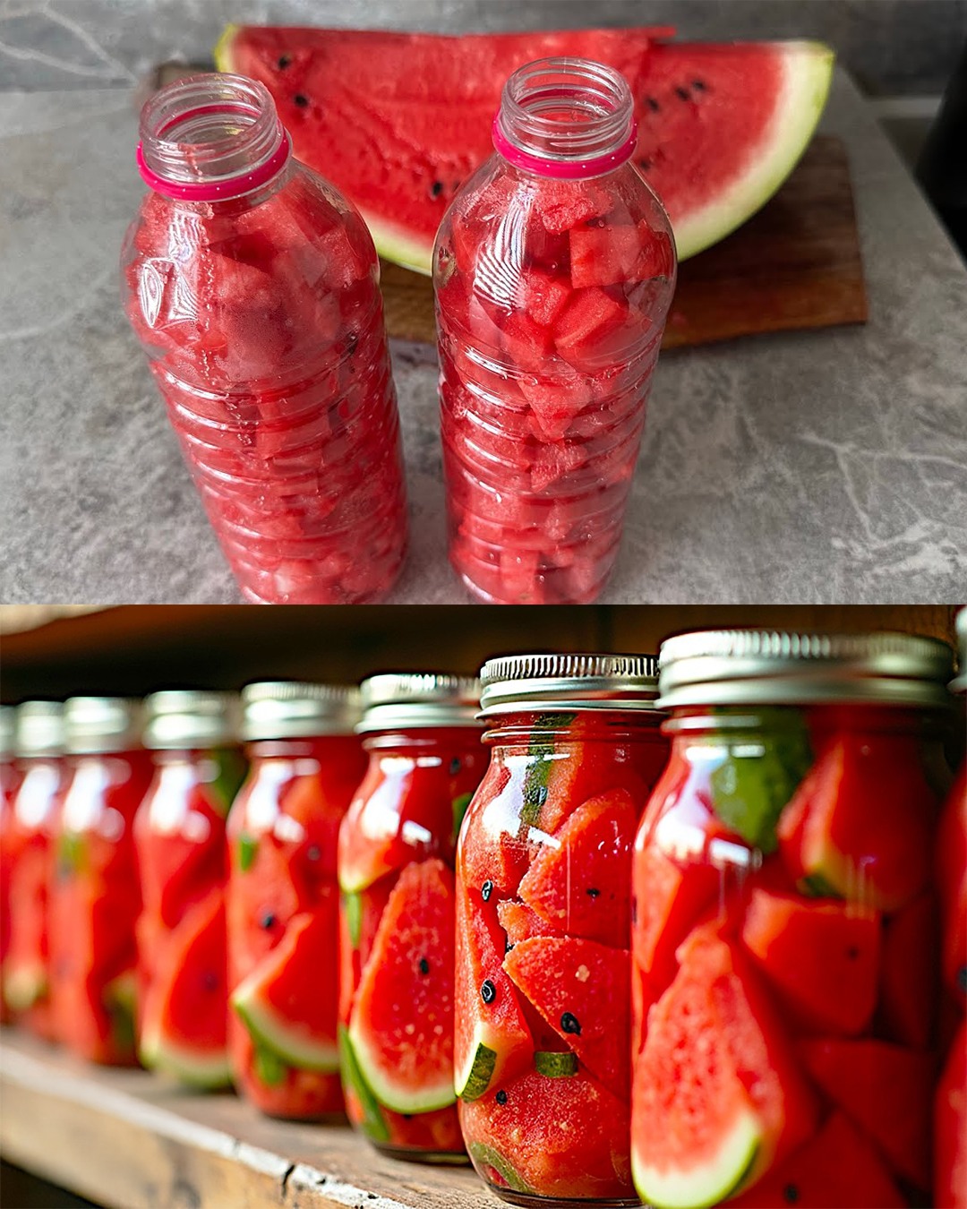 Mettere i pezzi di anguria ben stretti in barattoli puliti e asciutti. Riempire ogni barattolo fino all’orlo, lasciando un po’ di spazio per il condimento.