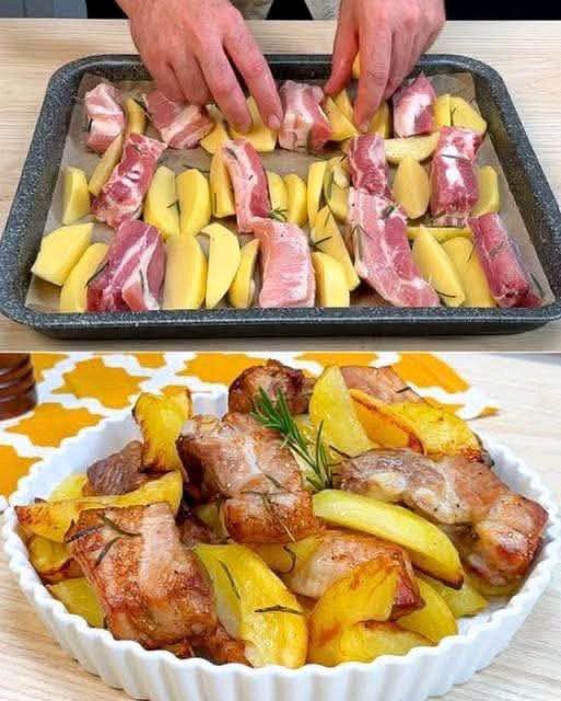 5. Disponi le costine e le patate in una teglia senza sovrapporle.