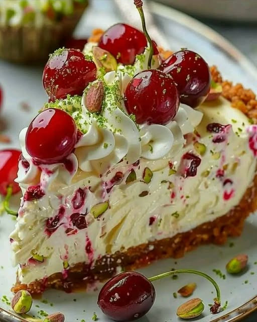 Deliziosa cheesecake al limone, lime, ciliegie e pistacchi