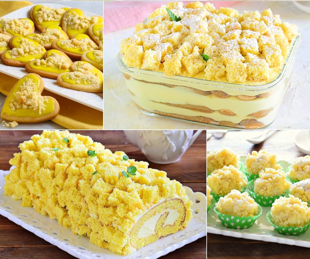 La mimosa può essere riprodotta anche in altri dessert: ne sono un esempio i cupcake, i biscotti, i tartufi e il rotolo che a lei si ispirano riproducendone i boccioli. Persino il tiramisù si veste di giallo, e per l’occasione viene farcito con una delicata crema al limoncello e decorato con cubetti di pan di Spagna.