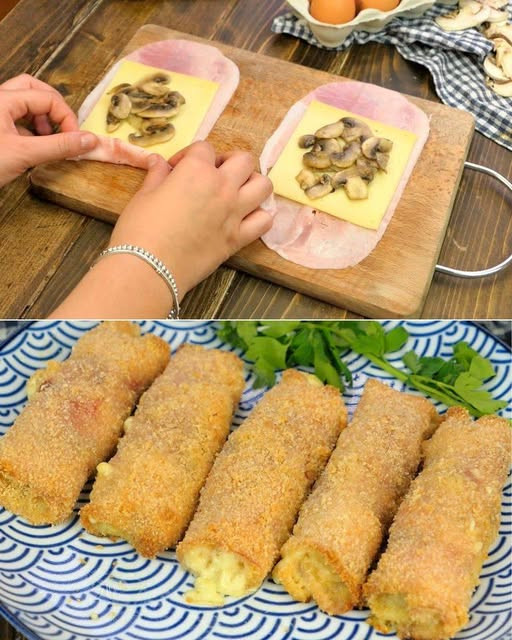 Involtini di prosciutto cotto, formaggio e funghi: rotolini sfiziosi. croccanti e saporiti!