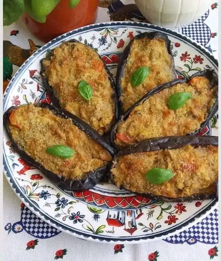 Ho tagliato a metà le melanzane , le ho sbollentate 5/6 minuti, poi ho scavato la calotta , togliendo la polpa….ho sistemato questa in una padella con un filo d’olio , aglio e fatto rosolare per 10 minuto appena…ho salato, tolto dal fuoco ed ho aggiunto il prosciutto , la provola, l’ uovo, il grana , il basilico a foglie intere ,ed i pomodorini a pezzetti….ho riempito le calotte di melanzane , ho cosparso il pangrattato ed infornato a 180 gradi …buon appetito!!!!..🌿🍆🍅🌿🍆🍅🌿🍆🍅🌿🍆🍅