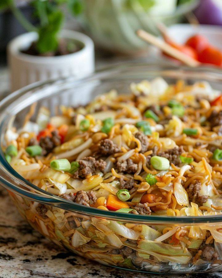 Questa casseruola di Chow Mein con cavolo e carne macinata è un piatto unico, sostanzioso e sostanzioso, che aggiunge un tocco unico a un piatto classico. Con saporita carne macinata, tenero cavolo e una saporita salsa di ispirazione asiatica, il tutto mescolato con noodles e cotto alla perfezione, questa casseruola è una cena facile e appagante per tutta la famiglia. Casseruola di Chow Mein con cavolo e carne macinata
