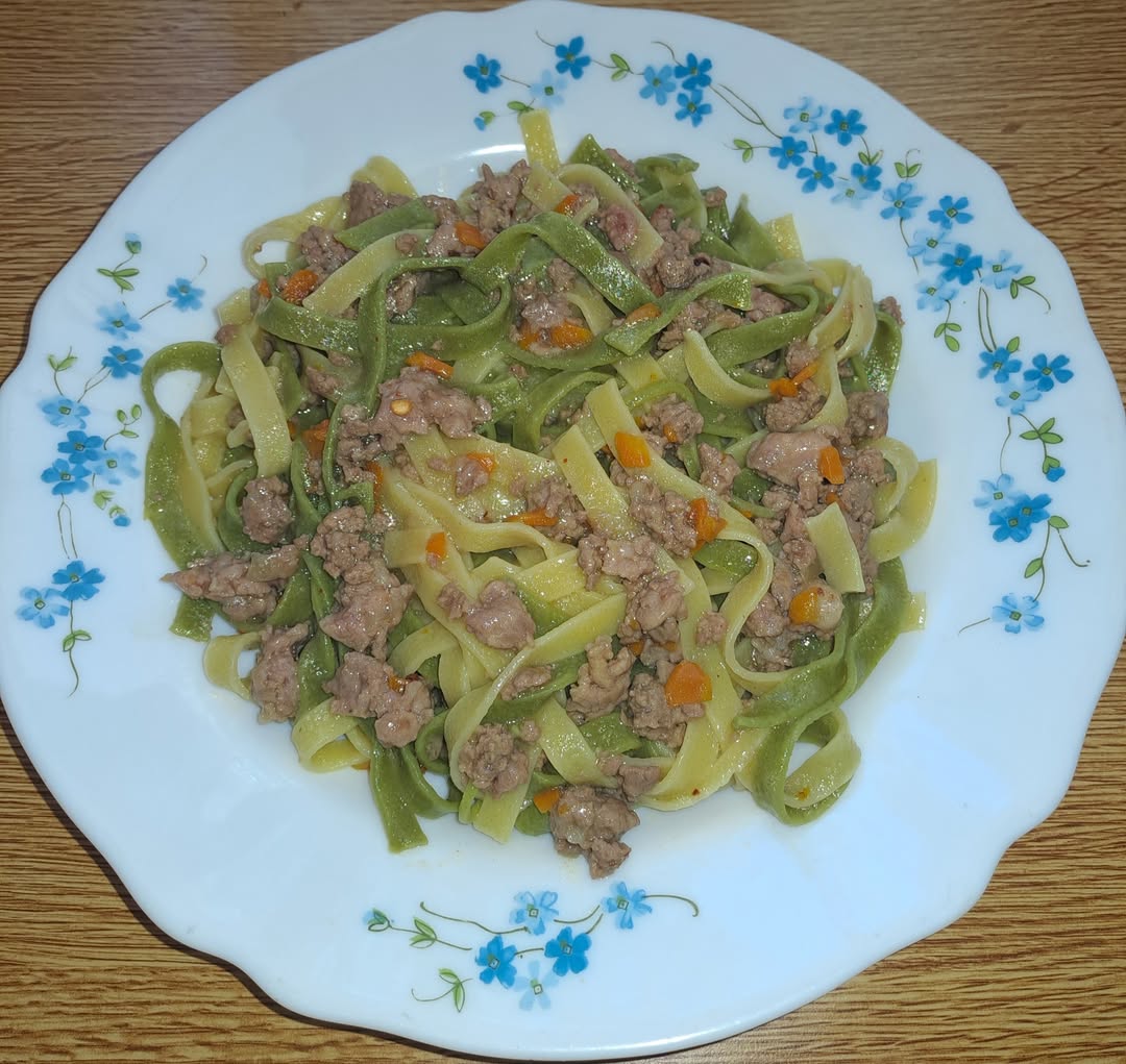 In una padella versare 3 cucchiai di olio e farvi rosolare carota e cipolla tritati finemente. Aggiungere le salsicce sbriciolate e il macinato. Dopo aver ben rosolato aggiungere mezzo bicchiere di vino bianco e continuare la cottura fino a che non si sia asciugato.