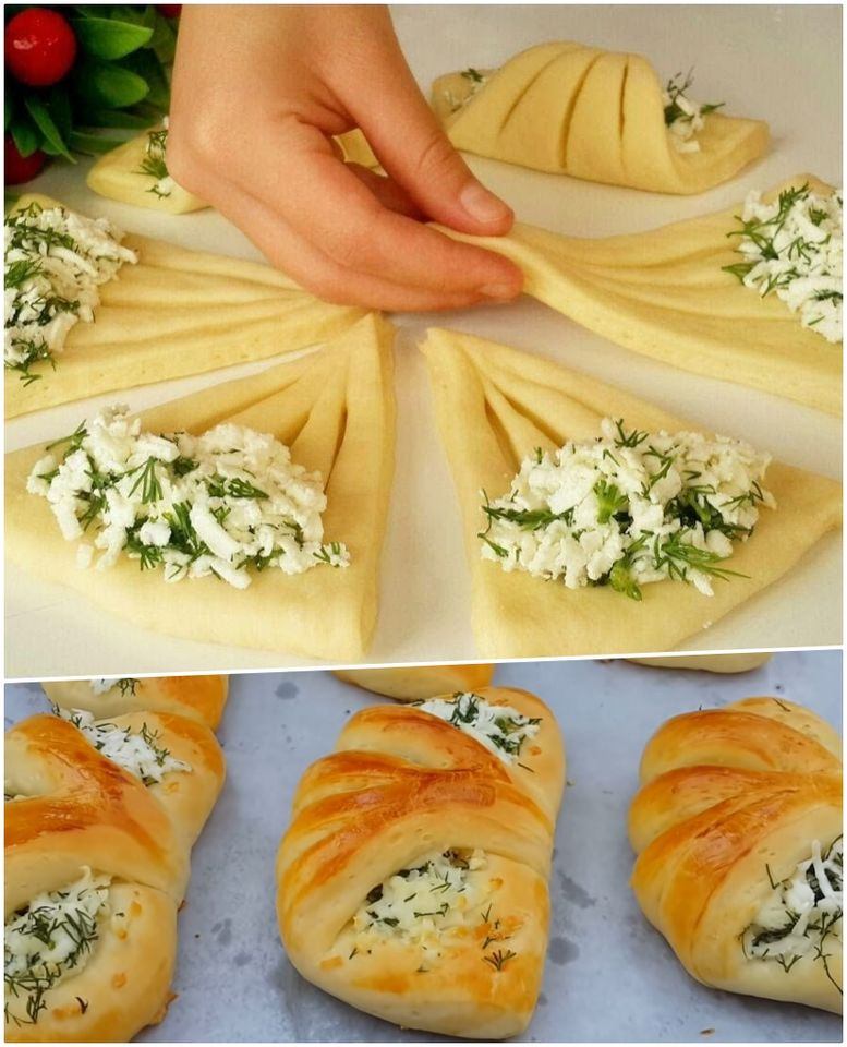Prendete il primo pezzo di impasto e stendetelo, su un piano di lavoro infarinato, in una superficie rotonda di 20-22 cm. tagliare in 6 triangoli e fare 3 tagli incompleti su ciascun triangolo. Allunghiamo un po’ i triangoli, con le mani, e mettiamo su ognuno 1 cucchiaio di ripieno.