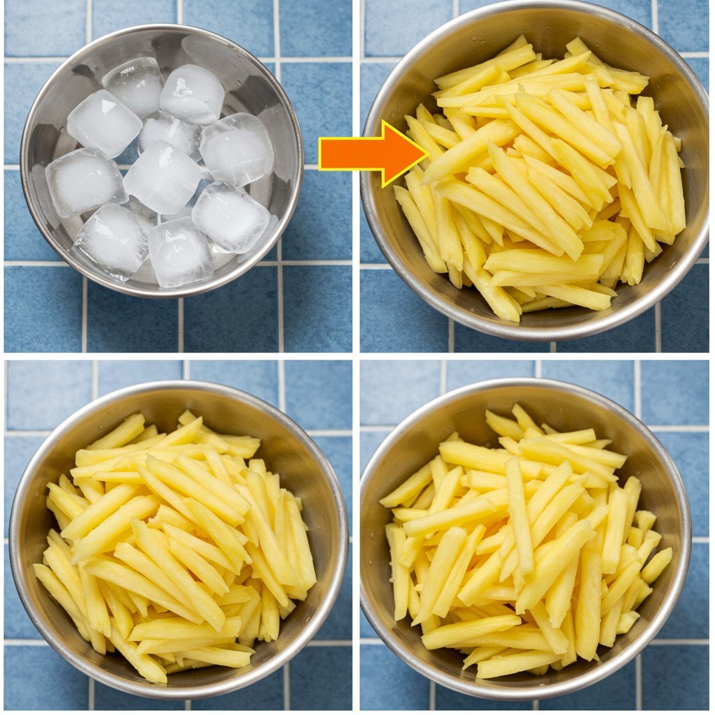 Avrete bisogno di una ciotola di acqua ghiacciata. Sbucciate le patate, tagliatele e immergetele nell’acqua, assicurandovi di aggiungere cubetti di ghiaccio. Lasciatele così per almeno 10 minuti (idealmente qualche ora, o anche di più se possibile, aggiungendo cubetti di ghiaccio regolarmente man mano che si sciolgono). Perché immergere le patate in acqua ghiacciata? Questo rimuoverà l’amido in eccesso dalla superficie ed eviterà che le patate si attacchino durante la frittura. Inoltre, le patate molto fredde, immerse nell’olio caldo, formano una crosticina esterna che le manterrà croccanti dopo la cottura.