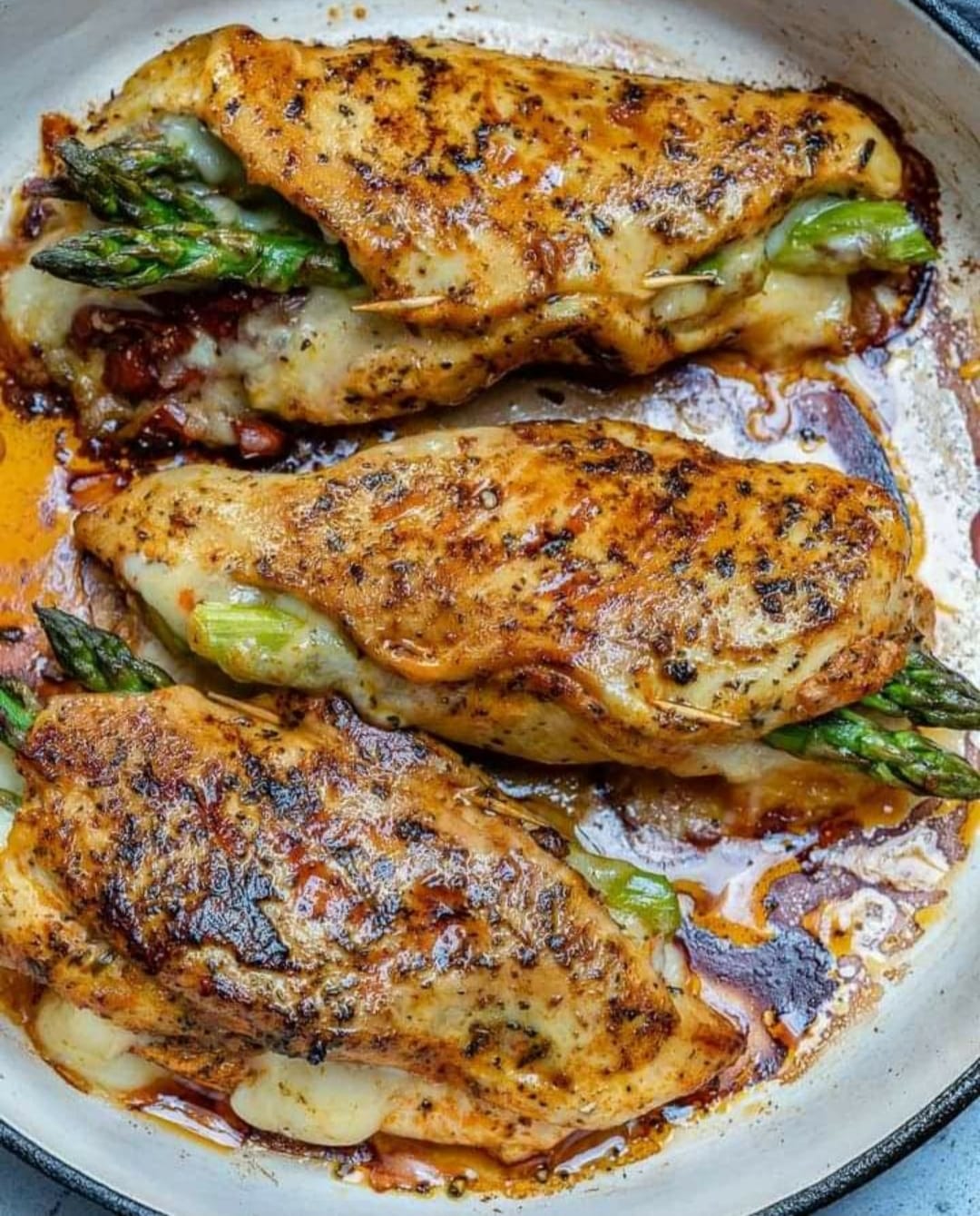 Metti 3 punte di asparagi e una generosa porzione di mozzarella su un’estremità di ciascun petto di pollo.