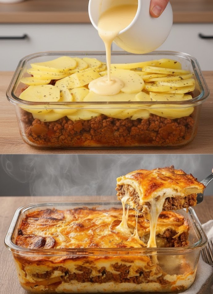 Patate tagliate sottili vengono condite con un ricco ragù di carne macinata, un cremoso composto di uova e latte e generosi strati di mozzarella fusa e Parmigiano. Il tutto viene cotto lentamente in forno fino a quando la superficie non diventa dorata, frizzante e assolutamente irresistibile.