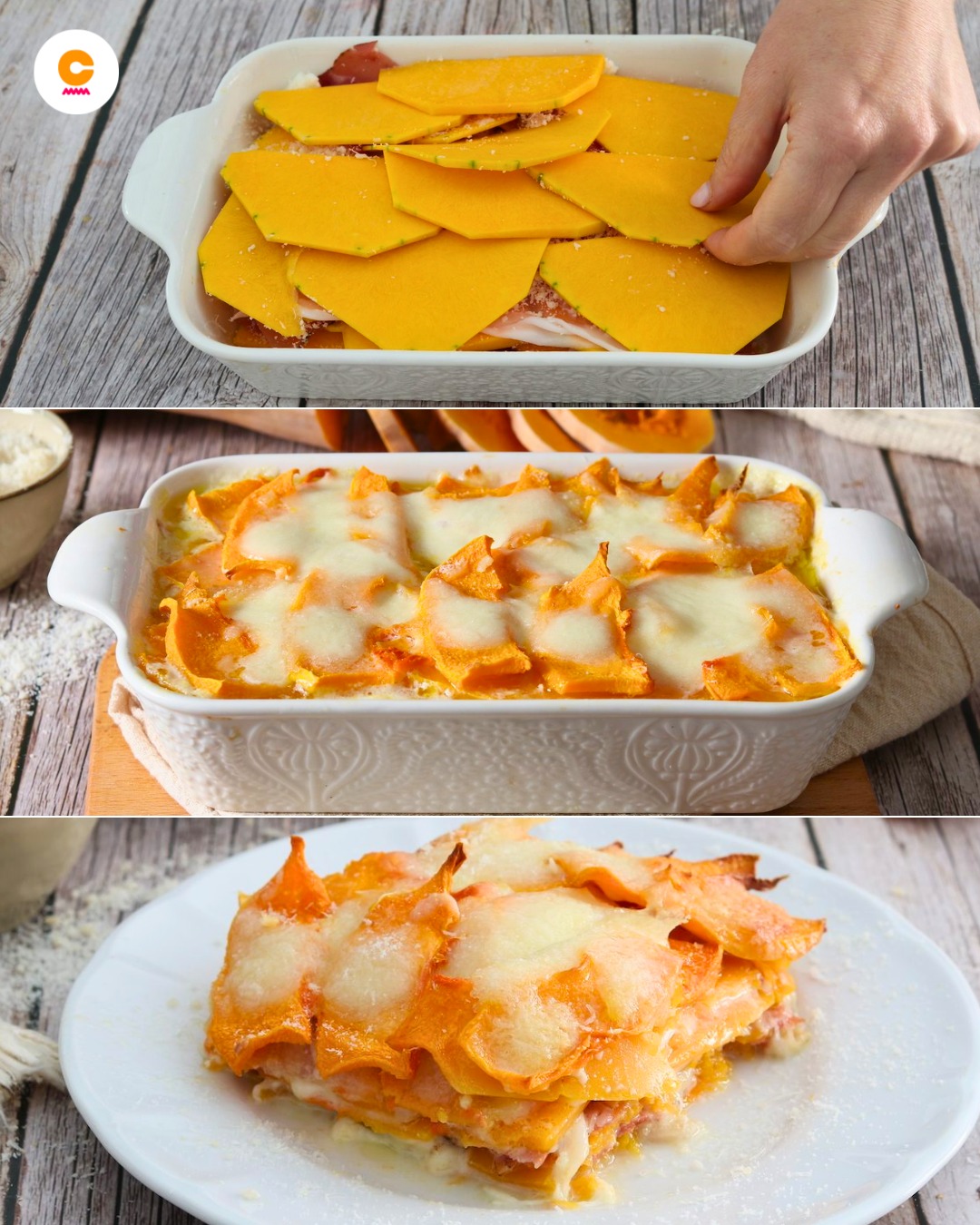Di facile esecuzione, nella nostra ricetta la zucca, sbucciata e ridotta a fettine spesse 2-3 mm, viene disposta a strati in una pirofila, alternata a speck tagliato sottile, cubetti di mozzarella ben asciutti e una generosa manciata di parmigiano grattugiato, quindi lasciata gratinare in forno preriscaldato a 165 °C per circa 40 minuti.