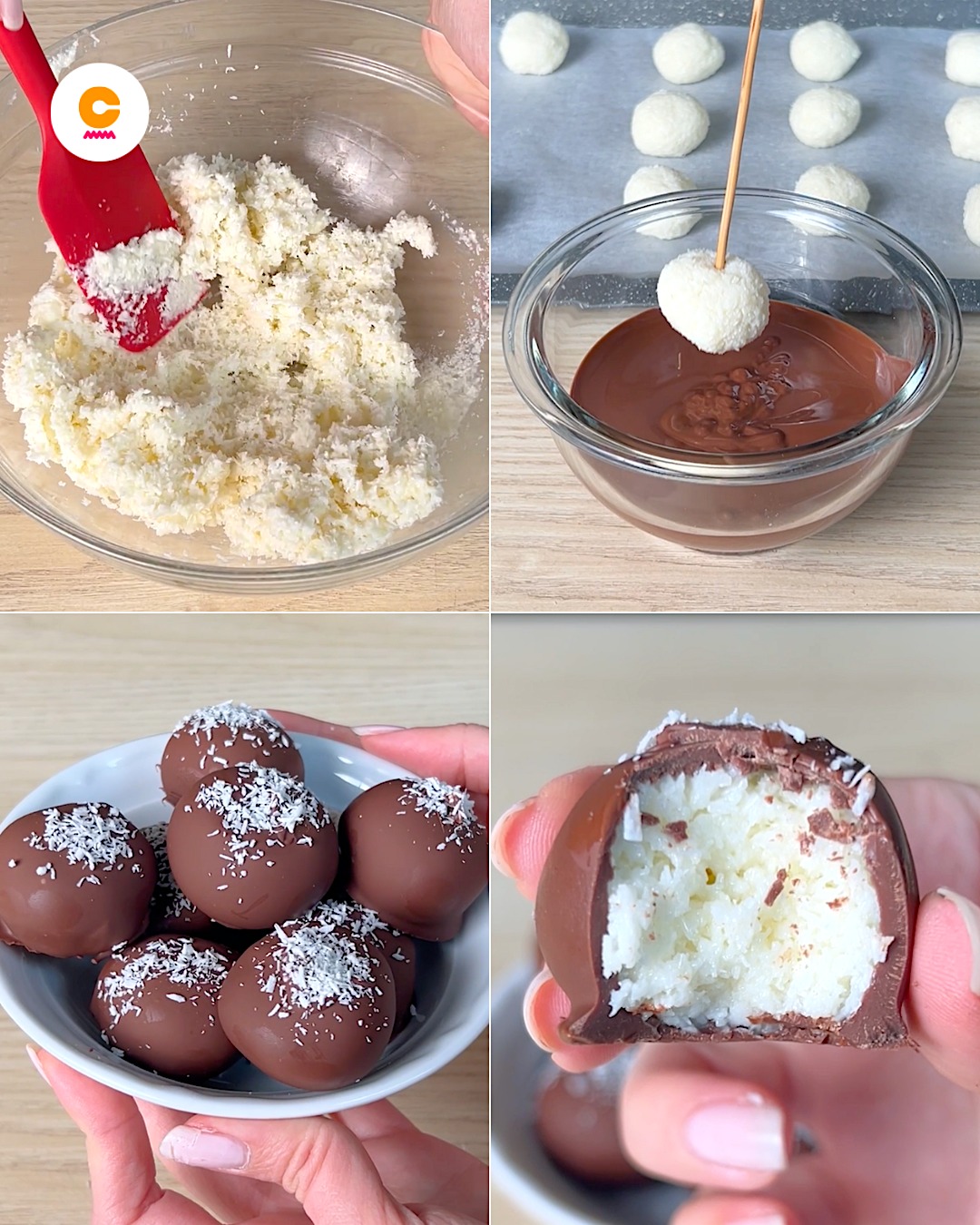 I tartufini al cocco sono dei dolcetti veloci e senza cottura preparati con solo 3 ingredienti: granella di cocco, latte condensato, cioccolato fuso. Per realizzarli basterà mescolare la granella di cocco con il latte condensato, formare delle palline e lasciarle riposare in freezer, prima di passarle nel cioccolato fuso. Le palline saranno decorate con granella di cocco e lasciate rassodare in frigo per pochi minuti, pronte da gustare. Servile come sfiziosa merenda o come veloce dessert a fine pasto. Ecco come prepararli.