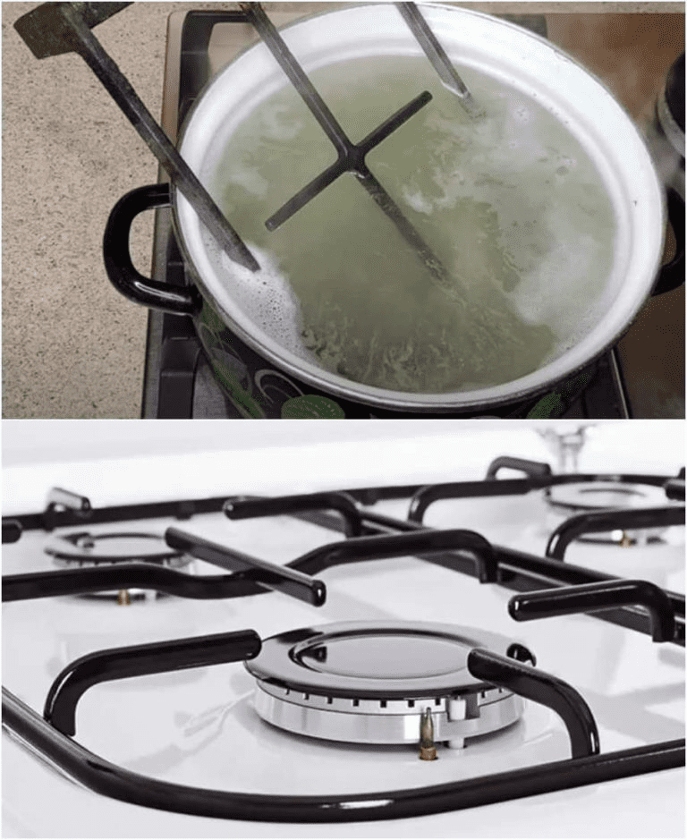 Per prima cosa devi prendere una pentola della misura della griglia, riempirla d’acqua e metterla sul fuoco. Aggiungi due pastiglie per lavastoviglie all’acqua. L’acqua dovrebbe bollire, quindi metti una griglia nella pentola e lascia bollire l’acqua per circa mezz’ora.